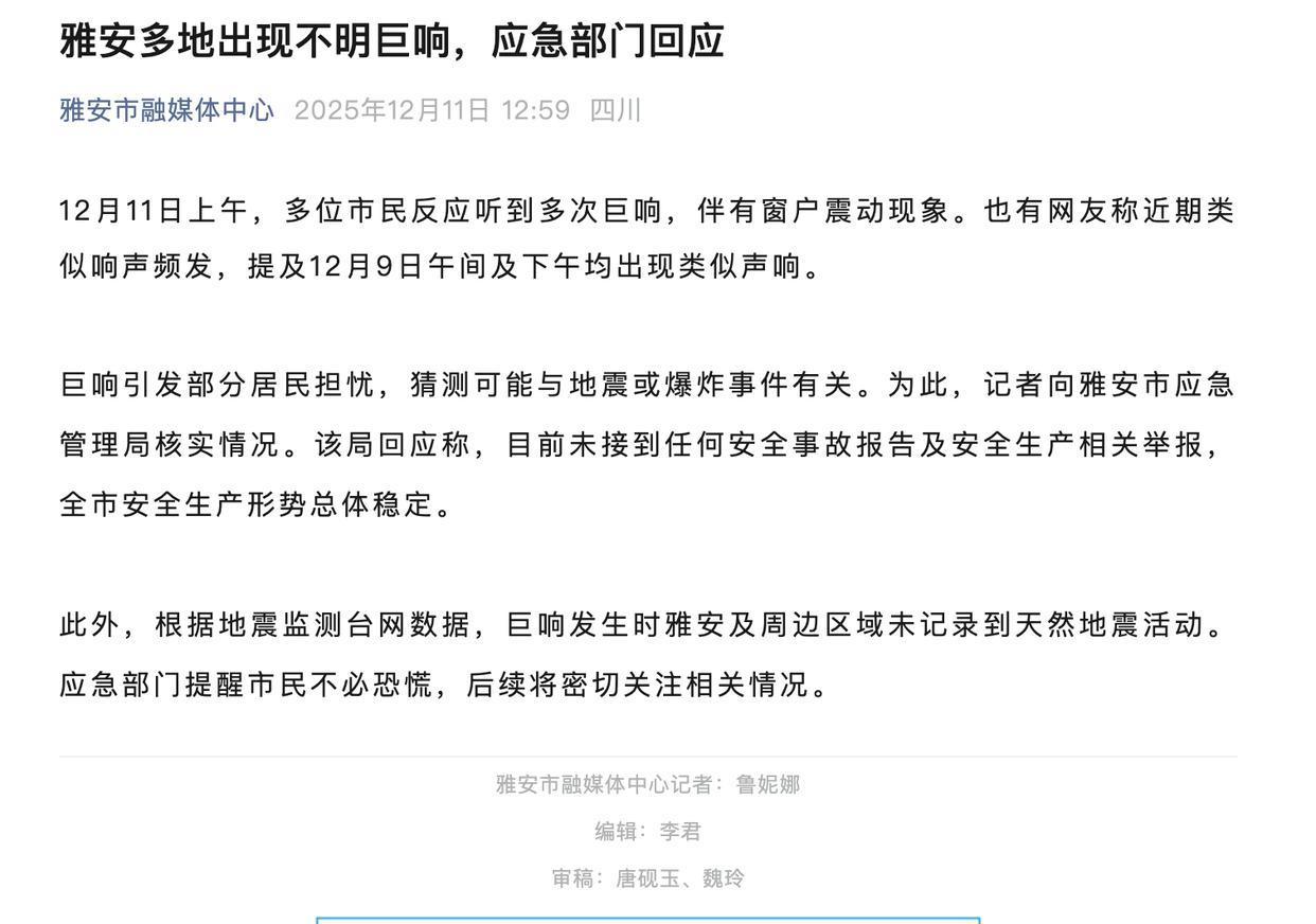 据四川雅安市融媒体中心音讯,12月11日上昼,多位市民反馈听到屡次巨响,伴有窗户滚动好意思瞻念。也有网友称近期近似响声频发,说起12月9日午间及下昼均出现近似声响。